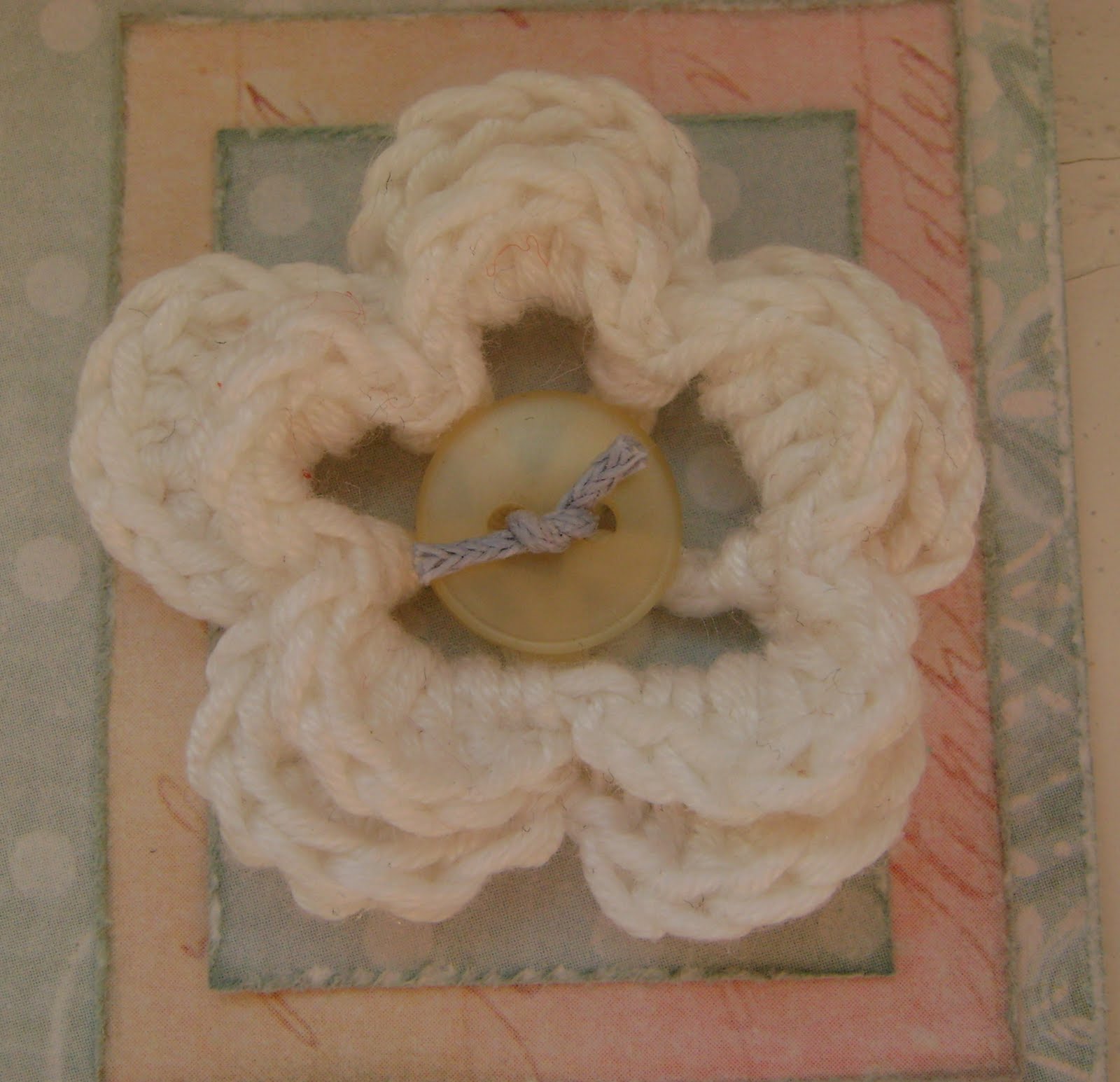цветок сделала из кусочка шитья, вязаного цветочка и пуговицы.